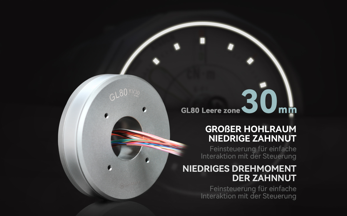 Der CubeMars GL80 KV30 Gimbal-Motor ist ein hochpräziser bürstenloser Motor aus der CubeMars GL-Serie, der speziell für Gimbal-Systeme, rotierende Scanning-Module und autonome Fahrerassistenzsysteme entwickelt wurde. Mit einer großen Hohlwelle, einer Struktur mit niedrigem Koggingmoment sowie einem leichten, kompakten Design bietet er außergewöhnliche Glätte und Stabilität bei feiner Positionierung und Langzeitbetriebsszenarien. Mit einem Gesamtgewicht von ca. 315 g, einem Spitzendrehmoment von 2,9 Nm und einem Schutzgrad IP45 gegen Staub und Wasser ist dieser Motor für zuverlässige Leistung in anspruchsvollen Anwendungen konstruiert.
