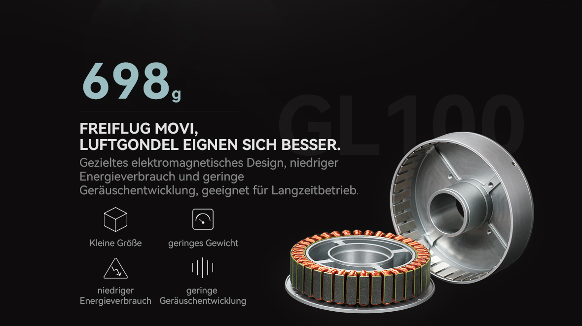 | GL Gimbal-Motoren | GL100 KV10 | 24 | 41 | 3 | 2.9 | 130 | 7.7 | 7.8 | 223 | 2650 | 2350 | 20 | 698 | Ф106.8*34.2 |