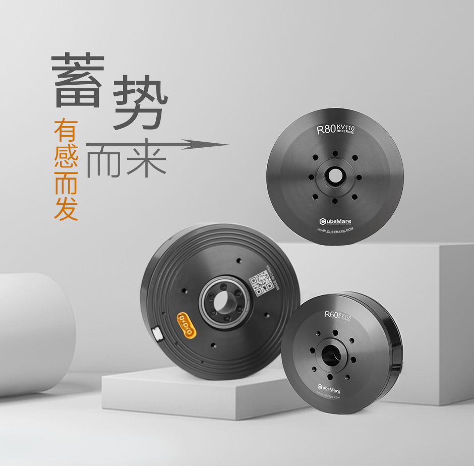 CubeMars直流无刷外转子电机R100, 整机外径106.8mm,扭矩高达11Nm,机身小扭矩大,可用于AGV, AMR等移动平台。