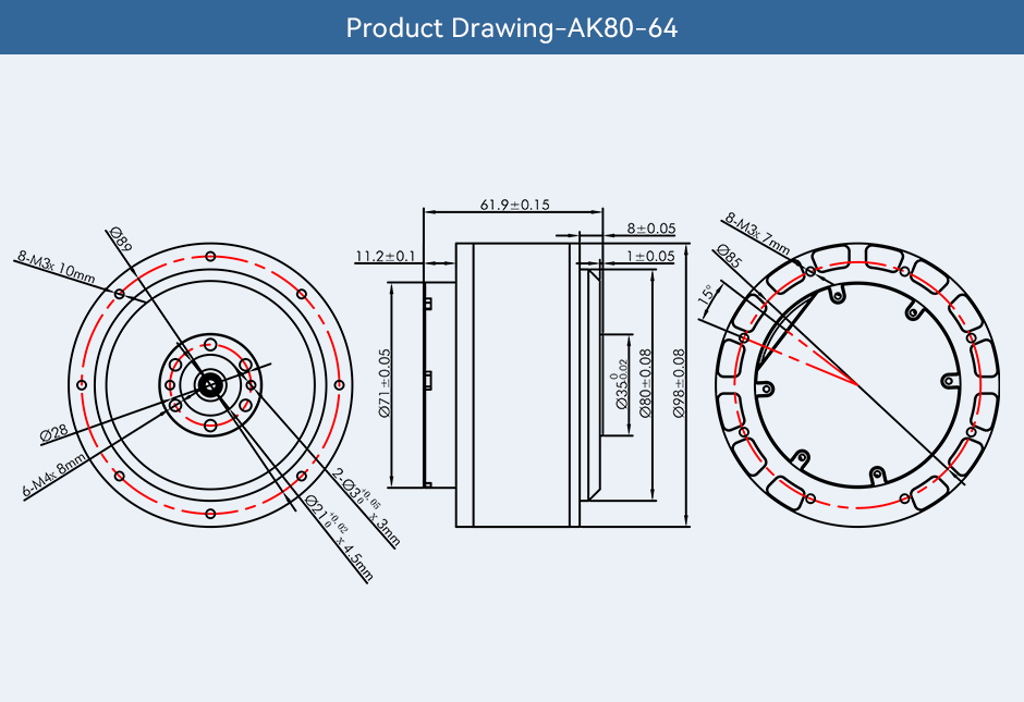 | AK Series Robotic Actuator | AK80-9 KV100 | 48 | 330 | 9 | 10.3 | 390 | 18 | 22.3 | 533 | 9:1 | 485 | Ф98*38.5 | Yes | Single |