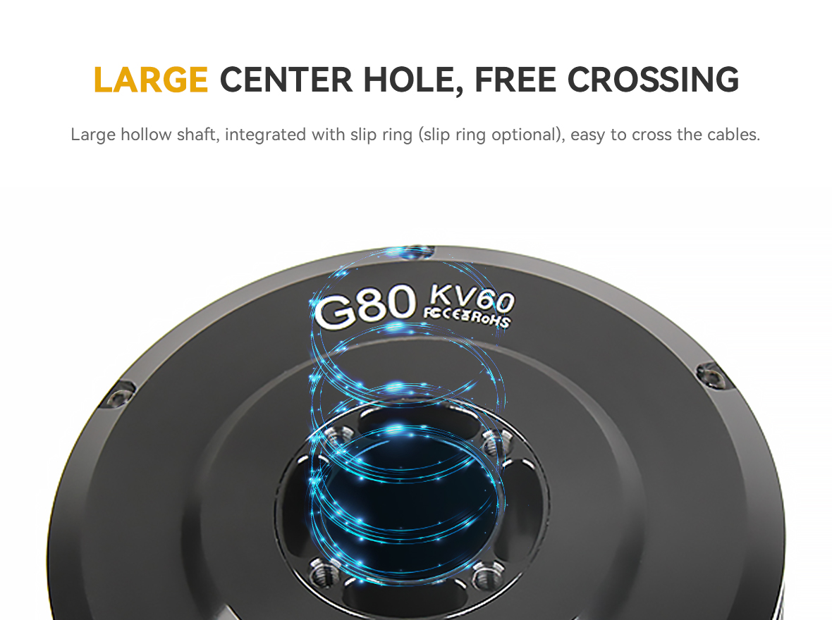 CubeMars G80 Gimbal Motor features a large central through-hole design that allows integration of an electrical slip ring, making it convenient for wiring. The G series gimbal motor have an overall low cogging torque, resulting in low energy consumption and enabling quick responses. With a high precision of 0.01°, these motors support various control modes, including speed and position control, providing precise and convenient control options.